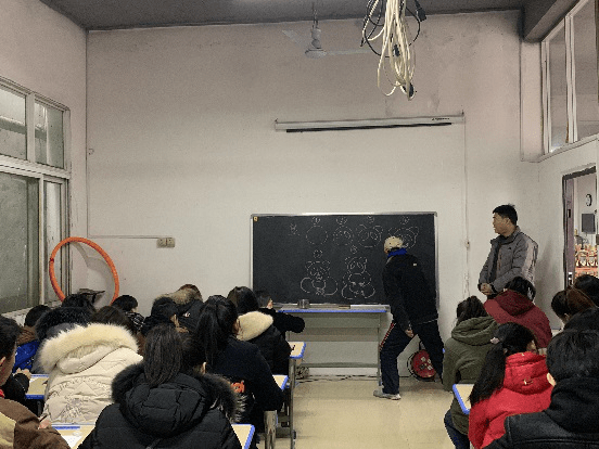 校區(qū)負(fù)責(zé)人何老師授課,慰問團(tuán)在學(xué)習(xí)簡單手語,以便于和學(xué)生們互動。